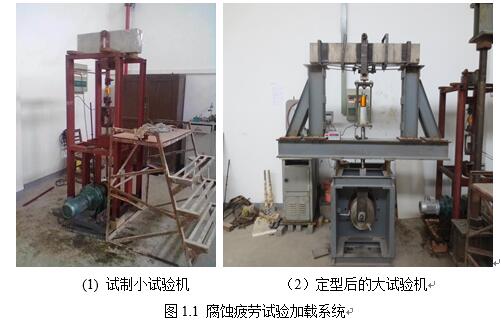 自主設計了一大一小兩套腐蝕疲勞試驗加載系統(tǒng)。該系統(tǒng)主要由四部分組成:動力設備、計數(shù)設備、控制設備和腐蝕箱,用軸承、連桿、插耳、螺栓等輔件將以上各個設備連成一個整體,組裝成簡易腐蝕疲勞加載系統(tǒng)。在總結該系統(tǒng)經驗的基礎上對其缺陷進行改進,制作了類似原理的另一套試驗設備,能對大尺寸梁進行加載。