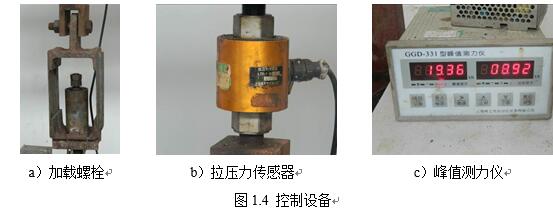 控制設備包括加載螺栓、力傳感器以及峰值測力儀等組成,見圖1.4。峰值測力儀采用上海梅立克自動化儀表有限公司生產的型號為GGD-331峰值測力儀,力傳感器為5t的拉壓力傳感器。旋轉加載螺栓對加載最大荷載進行控制,加載的最大荷載經拉壓力傳感器的感應,從峰值測力儀顯示最大力。峰值測力儀左側顯示的是每次循環(huán)加載中的最大荷載(小于10kN不顯示),右側圍動態(tài)顯示實時加載力。
